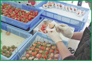 むつみ農園では、とちおとめ、紅ほっぺ、桃薫を主体に10種類ほどのいちごを栽培しており、平成23年度は全体で1万5千本の苗を定植。そのうち桃薫は1千本でした。桃薫の栽培はまだ少ないですが、需要が多いため、来年度は苗数を増やす予定です。