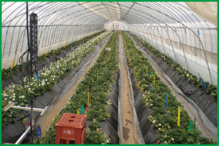 いちごハウス内(左側の花が旺盛な畝が桃薫)