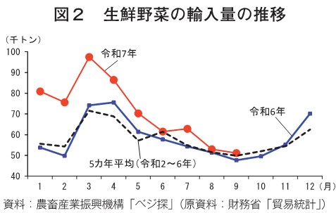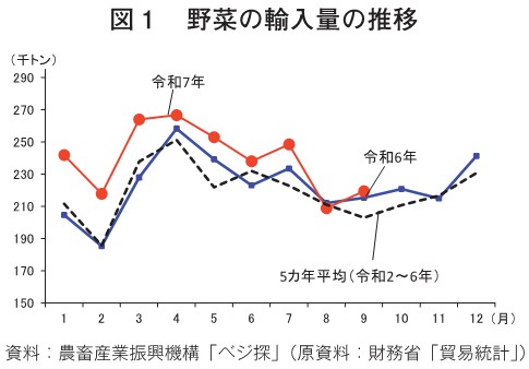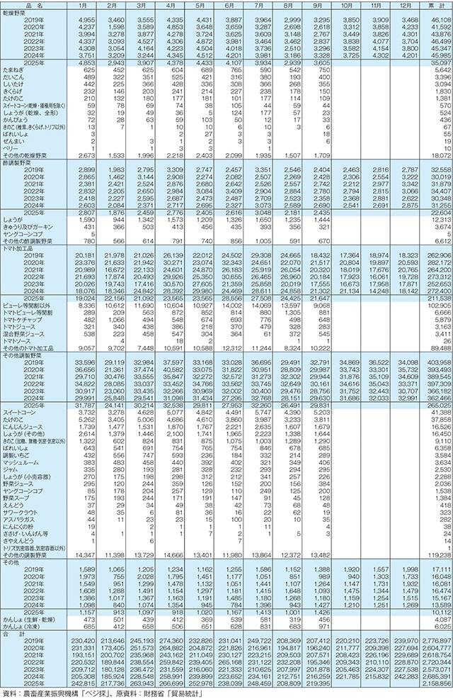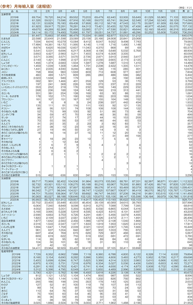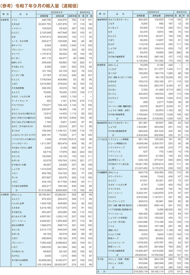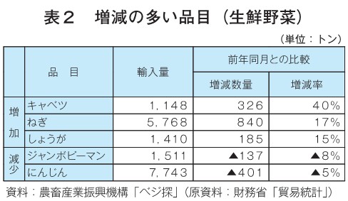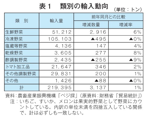 生鮮野菜および冷凍野菜以外の類別において、大きな変動のあった主要な品目の輸入量は、その他調製品のしょうが(その他)が1644トン(前年同月比29%増)、塩蔵等野菜のその他の塩蔵野菜が2196トン(同18%増)、トマト加工品のその他のトマト加工品が1万222トン(同11%増)、その他調製品のにんじんジュースが1679トン(同37%減)、トマト加工品のピューレ等関割以外が9068トン(同7%減)、その他調製品のスイートコーン5203トン(同3%減)などとなった。