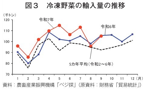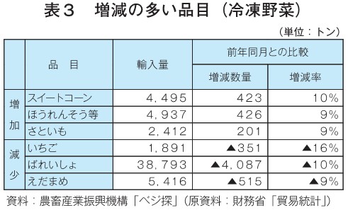冷凍野菜の輸入量は、スイートコーン、ほうれんそう等、さといもなどが前年をかなりの程度上回った一方、いちご、ばれいしょ、えだまめなどが前年をかなり下回り、全体では10万5103トン(前年同月比0%減)となった(図3、表3)。