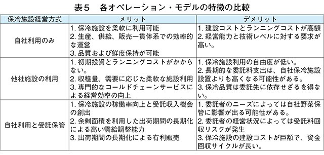 しかし、この経営方式には一定の課題とリスクがある。具体的には、1)受託保管は、委託者によってニーズや保管条件が異なるため、自社野菜の保管に影響を及ぼす可能性、2)委託者の経営が不安定な場合、受託料の回収リスクが高まる可能性、3)初期設備投資が巨額となり、資金回収サイクルが長い可能性、4)市場の需給変動などによる制御不能なリスクが、在庫の滞留や販売不振につながる可能性-などがある。このため、在庫や販売戦略を柔軟に調整する能力が求められる(表5)。