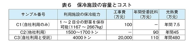 自社で保冷施設を設置する場合、初期投資や維持管理料は高額となるが、今後の野菜生産量を見越した施設整備が可能なことから、長期投資や大企業に適している。一方、賃貸方式による保冷施設の利用は初期投資負担の軽減となるが、委託料などを勘案すると自社で保冷施設を設置した場合の投資額を上回る可能性がある(表6)。