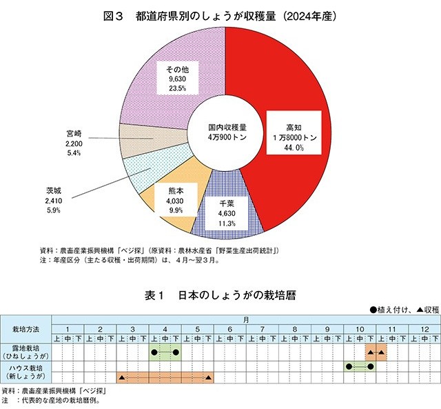 山東省のしょうが栽培は、露地栽培と施設(ハウス)栽培があり、このうち露地栽培の面積は全体の約90%以上を占める。露地栽培の植え付けは日本よりも10日程度早い3月下旬から開始し、収穫は日本よりも20日近く早く10月から開始する。早期出荷を目的とする施設栽培は、露地栽培よりも20日程度早い3月上旬から植え付けを開始し、秋季も露地より高い気温を維持できるため、収穫は9月中旬から11月中旬までと長期にわたる(表5)。