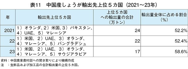 山東省の生産状況を見ると、23年の作付面積は全国の3割を占める10万4000ヘクタール(前年比11.8%増)となっている(表3)。中国国内の内需拡大や、海外からの需要増加を背景に価格が上昇してきたことで多くの生産者が作付けしたため、21年は作付面積が13万4000ヘクタールに増加した。しかし、供給過多により22年は一転して大幅に減少したものの、22年産が不作で前年在庫が品薄になったことなどから価格が回復し、23年の作付面積は前年をかなり大きく上回った。単収は、10アール当たり5トン前後で推移しており、栽培管理技術の改善や天候に恵まれたこともあり、23年は前年を大幅に上回る同5.6トン(同19.1%増)となった。