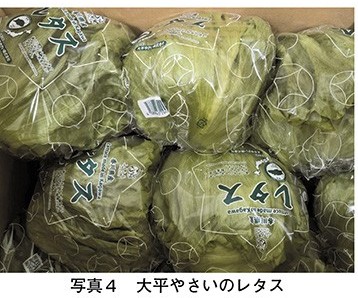 大平やさいは、過去にスポット的なレタス輸出に取り組んだ経験から、輸出先までの品質保持のために、輸送中の温度変化への対応が極めて重要であると判断し、徹底した温度管理に取り組んでいる(輸送中のコンテナ内の温度を2℃まで落とす事例もある)。輸出が軌道に乗り始めた5年に、さらなる取扱量の拡大を目指して、集出荷貯蔵施設を新設して短期間で冷却可能な真空予冷装置を導入し(写真3)、収穫後の野菜の鮮度の長時間保持が可能なコールドチェーンシステムの強化に取り組んだ。真空予冷機導入前、ドンドンドンキ以前に、別の企業との輸出取引をした際は、コンテナ内の温度を7℃で輸送していた。その時はロス率が50%と高く、さらに輸送中に2~3時間程度常温となる時間帯があったケースもあり、このような輸送体制もロス率を高めていたと考えられる。真空予冷機導入後の現在のロス率は0.03%であることを鑑みると、大平やさいが導入したコールドチェーンシステムの効果が理解できよう。一般的にレタスなどの葉物野菜は、収穫から時間が経過するにつれ組織が分解されるなどの理由で傷みやすくなり、鮮度が落ちる特性がある。鮮度維持のためには収穫後から短期間で冷却する必要があることを踏まえると、遠隔地への長距離輸送が避けられない輸出には、前述の真空予冷機のような設備の導入は効果的な取り組みと言えよう。