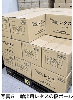 輸出相手先への輸送は、温度調整が可能なリーファーコンテナを利用しており、荷姿は段ボールである(写真5)。1箱当たりレタス14玉、ロメインレタス18玉である。国内から積み出す港湾は、ほぼ全量が東京港であり、ごく一部のみが福岡港を利用している。大平やさいから輸出先への輸送は船便が中心であり、シンガポール又は香港まではおおむね2週間程度を要していた(グアム便は少量なので航空便)。