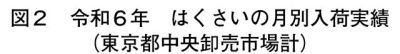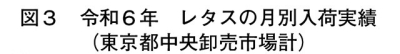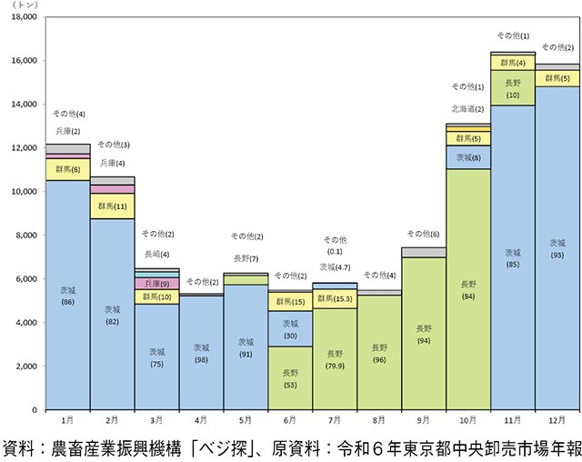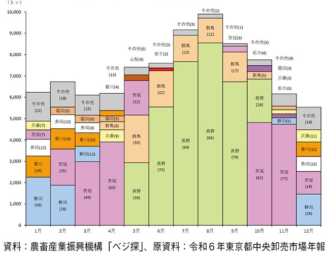令和6年の東京都中央卸売市場の月別入荷実績を見ると、1~5月にかけて茨城産が中心となり、その他、近隣の群馬産に加え、関西の兵庫産の入荷がある。6月以降は長野産が中心で、その他茨城産、群馬産の入荷がある。11月以降は再び茨城産が中心となる(図2)。