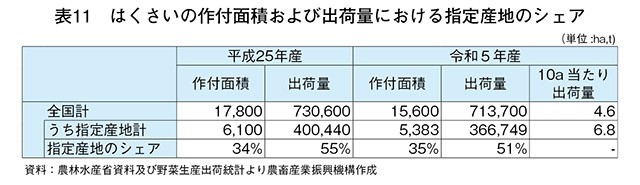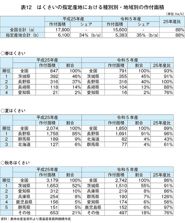 平成25年産から令和5年産にかけてのはくさいの作付面積は、1万7800ヘクタールから1万5600ヘクタールへと12%減少しており、すべての種別で減少した(表1)。