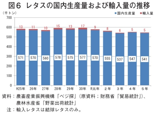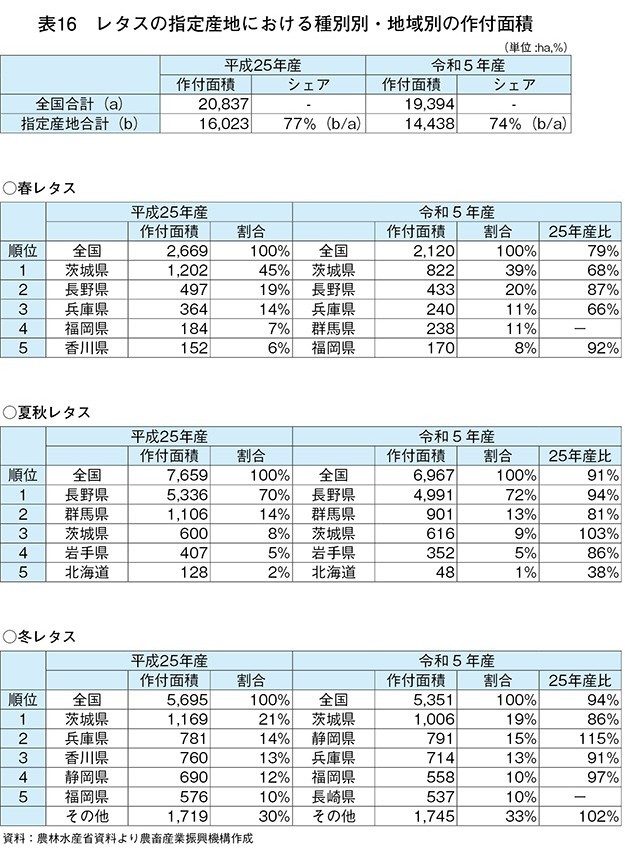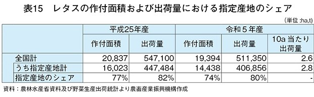平成25年産から令和5年産にかけてのレタスの作付面積は7%減少し、すべての種別で減少した(表5)。