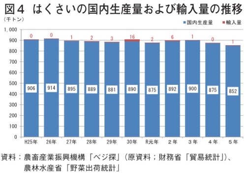 この要因として、量販店での少量カット売り(4分の1、8分の1など)により単身世帯でも購入しやすくなったことや、鍋つゆなどの家庭で手軽に使える調味料が普及したことなどが考えられる。はくさいは、味は淡白だがビタミンCとKが比較的多く、繊維質も豊富に含まれる。また、漬物、鍋物、炒め物など、和洋中どの料理にも使える素材として、多様な食文化が定着しているわが国では欠かせない野菜である。