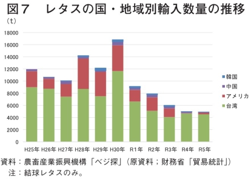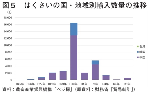 国・地域別輸入量は、中国に次いで韓国からの輸入が多くなっているが、中国が圧倒的なシェアを占めている(図5)。輸入品は、主に加工・業務用として利用されるが、平成30年に16万トンと他の年より輸入量が多かった理由は、平成29年秋の台風が、秋冬野菜の最終の定植直後に到来したため
