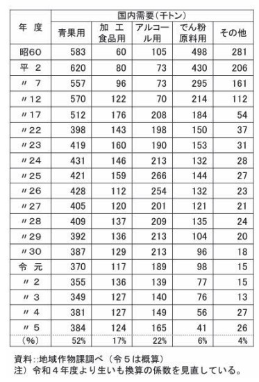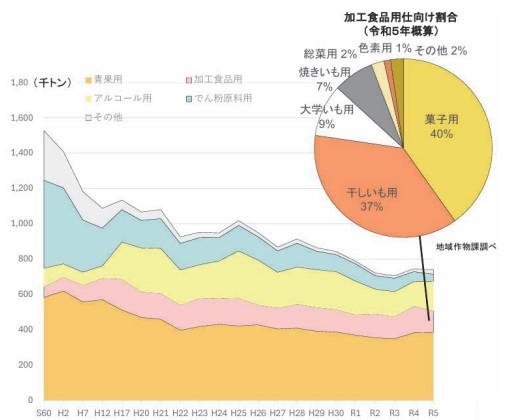 かんしょの国内生産量は、2023(令和5)年時点で72万トンであり(農林水産省農産局地域作物課)、約20年で3割減となっている。減少要因は、1)高齢化、2)離農、3)病気(基腐病)―といわれており、特に病気の影響は大きく、被害が大きかった九州で収穫量が大幅減した結果、温暖化の影響により栽培適地となった北海道での栽培が拡大しつつある。