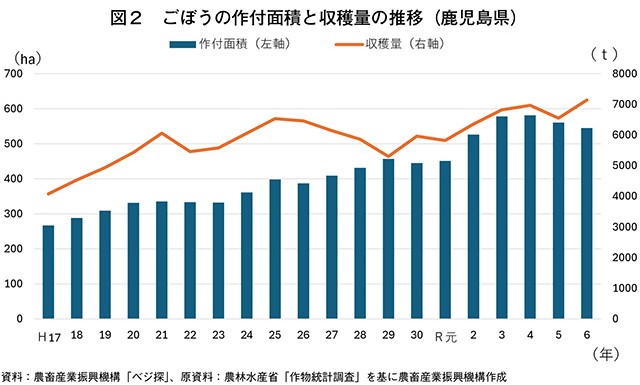 基腐病による被害が拡大したことであった。これまで生産していた青果用、加工用およびでん粉原料用かんしょの代替作物を模索していた同社は、同じ季節に生産が可能で、近隣に加工業者が多く、需要が見込まれるごぼうに着目し、作付面積を増やした。令和3年には独立行政法人農畜産業振興機構の「端境期等対策産地育成強化推進事業」を活用し、6年産のごぼうの作付面積は18ヘクタール、生産量は約260トンとなった。直近3年間は作付面積、生産量ともにほぼ横ばいで推移している。