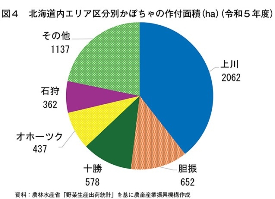 北海道は、日本最大のかぼちゃの生産地であり、収穫量は全国の約5割を占めている(図3)。特に上川地域は作付面積が道内の約4割を占めており、このほかに空知、オホーツク地方などでも盛んに栽培されてきた(図4)。これらの地域は、気候や土壌特性がかぼちゃの生育に適しており、北海道の主産地として、安定した生産基盤を形成している。しかし、近年、労働力不足が深刻化する中で、かぼちゃは重量があって収穫作業の負担が大きい「重量作物」であることから、道内の作付面積は直近10年で17%減少するなど、年々減少傾向にあった(図5)。