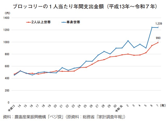 生鮮と冷凍を合わせたブロッコリーの輸入量について見ると、平成12(2000)年から令和7(2025)年の25年間の長期の推移は、平成12年頃は、生鮮ものについては約8万トンで推移していたが年々減少し、令和元年には1万トンを下回り、その後も減少して、令和7年は2000トンを下回った。一方、冷凍ものは、平成12年には1万5000トン程度であったが、年々増加して、平成26年に生鮮ものを上回り、この年以降、冷凍ものと生鮮ものが逆転し、令和7年の冷凍ものは9万5000トンを超えた。